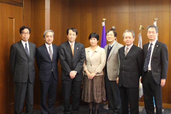 ((左から)鈴木 雅和名誉教授・佐野 淳教授・永田 恭介学長・稲永 由紀講師・坪内 孝司教授・青嶋 誠教授・木越 英夫副学長)