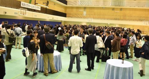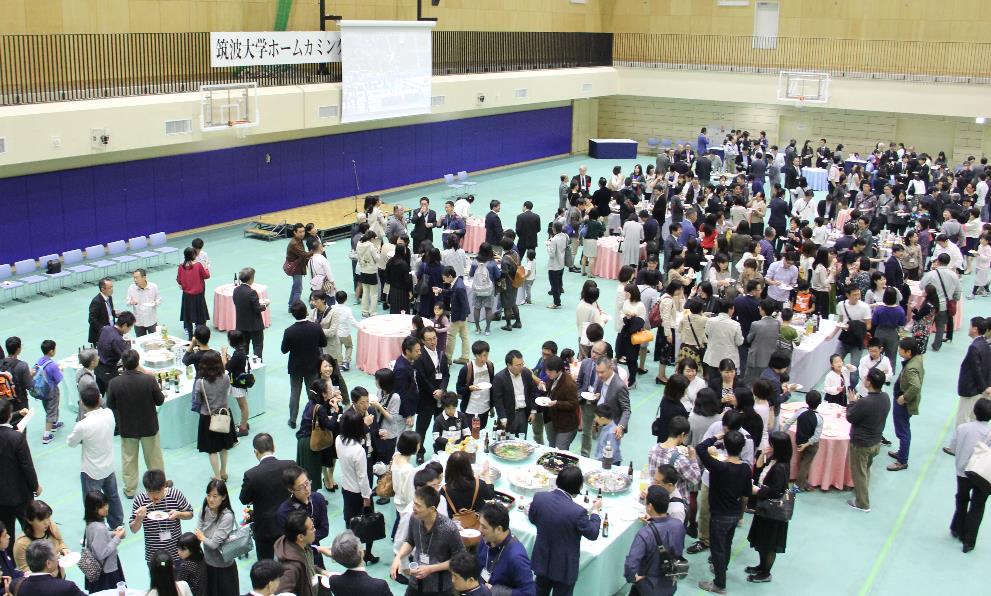 今年は,学群・学部卒業生については平成5年度入学生を,また,大学院修了生については,今回お招きしている卒業生の大学院進学と同年度となる平成9年度に本学大学院に入学された方をご招待しました。それぞれのご家族,当時教鞭をとられていた退職教員もお招きし,本学関係者と合わせ450名を超える方々が一堂に集い,例年にない大盛況となりました。 初貝安弘ホームカミングデー委員会委員長(理工学群副理工学群長)が司会を務め,本学からは,永田恭介学長をはじめ,副学長,学群長,学類長,研究科長等が出席し,会の冒頭で永田学長から歓迎の挨拶がありました。