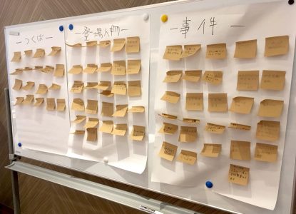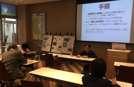 午後は引き続き横井先生が「創造と社会〜創作の歴史と個人の創作」をテーマに講演会を行いました。サッカーの試合に端を発する2国間の争いや自動車のモデルチェンジ戦略などを例に,「物語」が社会に与える影響の大きさと創作者の心得,デザイン思考の有用性など,熱い語り口で参加者を惹き付けていました。また,「学園都市と名探偵」を題材に,参加者を交えた物語作りの実演を行いました。