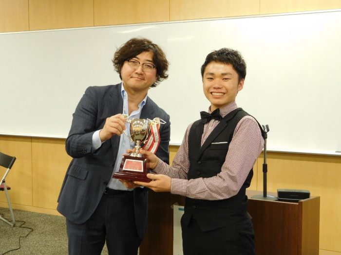 「下痢チェッカー」チーム代表の高橋晃平氏(生命環境学群3年)には,森川氏から優勝カップが手渡されました。副賞は,筑波みらいの会(筑波大学出身経営者の会)から「協賛金10万円の贈呈,平砂インキュベーションオフィスの使用許可」です。