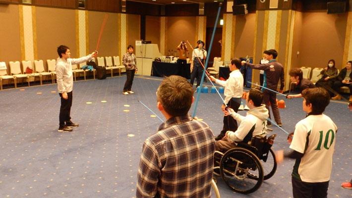フェンシング体験ゾーンでは,千田健太氏が講師となり,基本ステップや武器・防具に関する説明,そして日本フェンシング協会の体験キットを使用した実戦形式の体験も行いました。