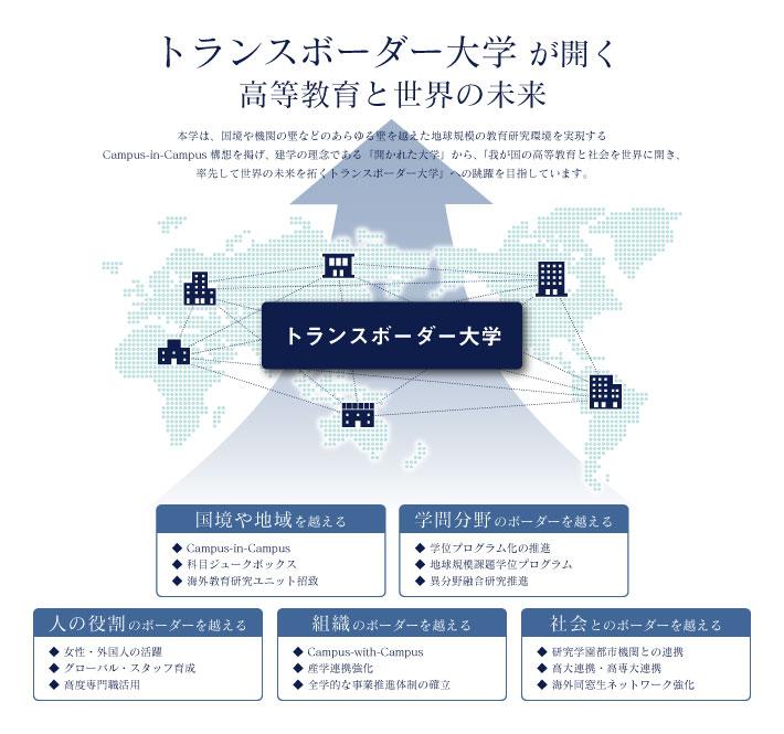 日本の高等教育の国際通用性と国際競争力を向上することを目的に,徹底した大学改革や国際化を進める大学を重点的に支援する文部科学省の補助事業(事業期間:2014年-2023年)です。本学の構想「トランスボーダー大学がひらく高等教育と世界の未来」は,世界レベルの教育研究を行うトップ大学(タイプA)として採択されています。本学の構想概要