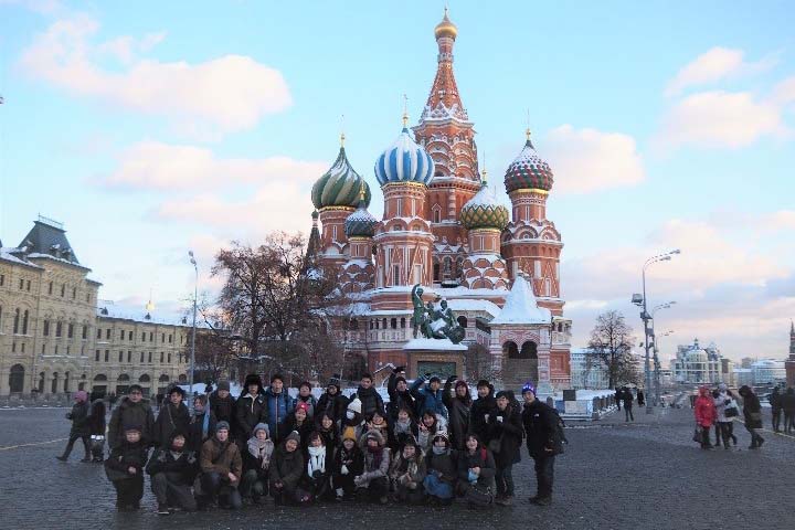 研修は2コースに分かれて実施され,ロシア2都市コース(モスクワ・サンクトペテルブルグ)に12名,ロシア・アルメニアコース(モスクワ・エレバン)に13名の学生が参加しました。2つのコースとも2月23日までほぼ同じ日程でモスクワに滞在し,その後,ロシア2都市コースはサンクトペテルブルグへ、ロシア・アルメニアコースはアルメニアの首都エレバンにて研修を行いました。