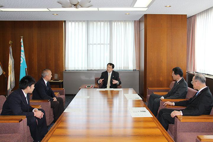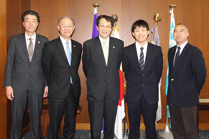 両大会の成績を報告するため,4月2日に宮地選手が渡辺良夫教授(体育系)とともに,永田恭介学長及び佐藤忍副学長(学生担当),清水諭副学長(教育担当)を表敬訪問しました。