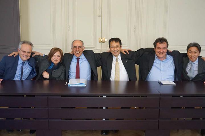 ((ボルドー大学)左からLaurent Servant国際関係担当副学長,ベントン副学長,Manuel Tunon de Lara学長,永田学長,Antoine de Daruvar統括副学長,大根田大学執行役員)