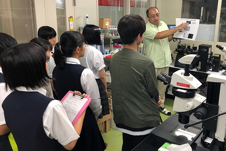 また,中程のプログラムでは,実際に研究室を訪れ,電子顕微鏡やセルソーターなど最新の研究機器を見学し,組織の染色の方法や目的のたんぱく質の回収方法など,その原理を含めて説明を受けました。さらに,溶液の中に含まれるDNAの抽出の方法について学び,実際に抽出実験を体験しました。