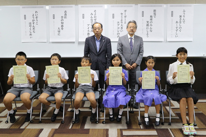 省エネ・節電行動計画の一環として,附属学校の小学生を対象に募集した筑波大学夏季省エネ・節電標語〔平成30年度〕について,9月5日に東京キャンパス文京校舎において,最優秀賞と優秀賞を受賞した児童に集まっていただき表彰式を開催しました。