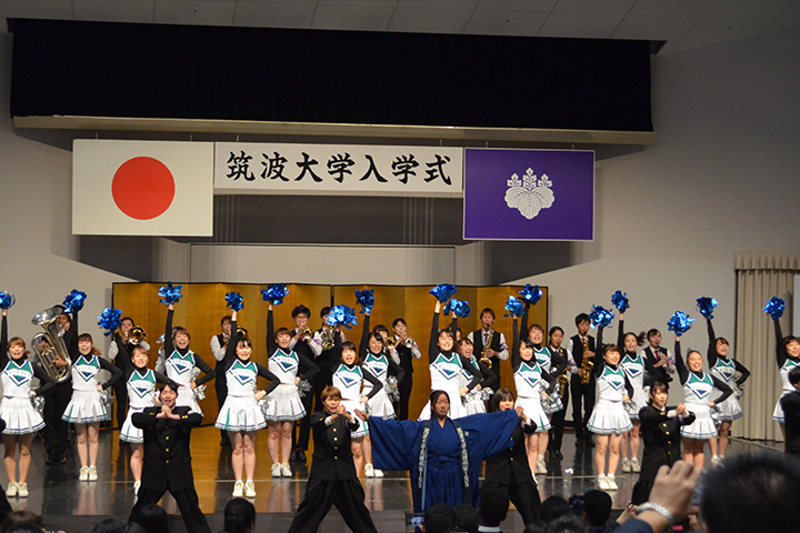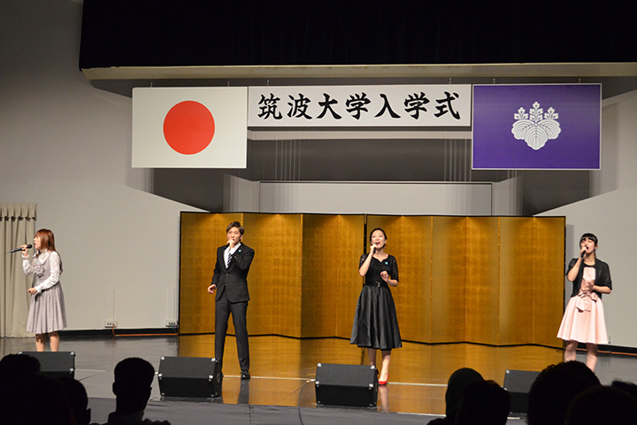 また、入学式終了後、髙藤真依氏(人間総合科学研究科)、佐藤悠樹氏(人間総合科学研究科)、安田まり奈氏(生命環境科学研究科)、戸川千勢氏(人文・文化学群)による歓迎の歌「筑波大学メッセージソング『IMAGINE THE FUTURE~未来を想え』」の歌唱及び筑波大学応援部WINSから新入生にエールが送られました。