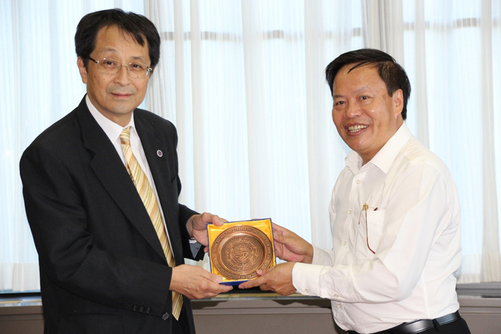 今回の来訪は,かねてから研究交流があった藻類バイオマス・エネルギーシステム開発センターの視察と,教育研究に関する意見交換が目的です。来訪者のVinh学科長は本学の卒業生であり,現在もベトナム人同窓会の副代表を務めています。