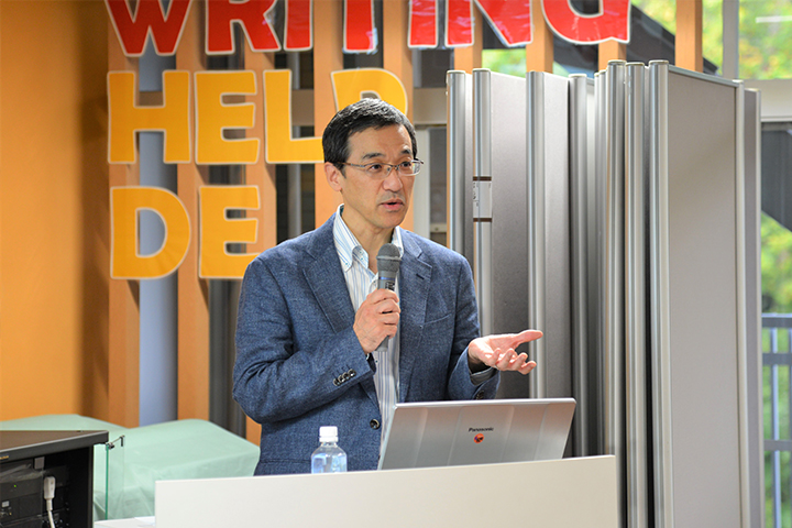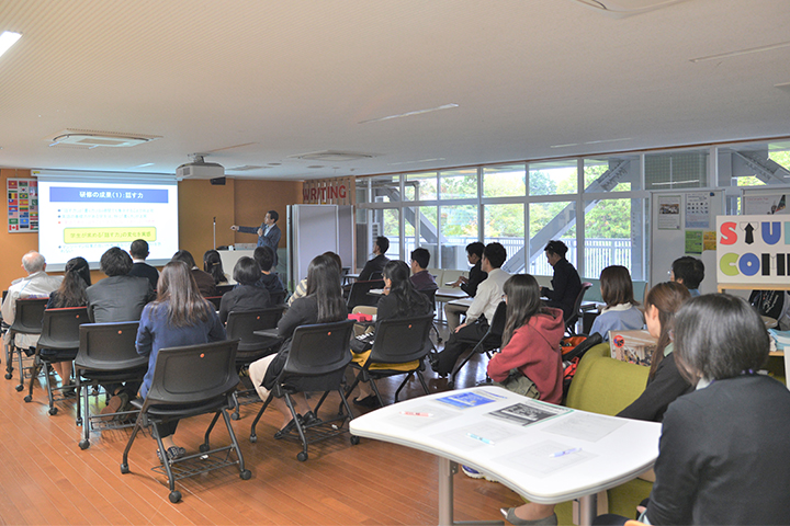 この研修では、グローバル・コモンズ機構国際交流支援部門/人文社会系の鈴木伸隆准教授を講師として、今夏グローバル・コモンズ機構・学生部学生交流課が主催したフィリピンのセブでの英語研修の内容を紹介し、成果や今後の課題を示しました。 セブでの英語研修は、「はばたけ!筑大生」奨学金の給付を受けた11名の学生に、4週間、朝7時から夜10時まで英語だけの生活を送る機会を与えるもので、鈴木准教授からは、参加学生の研修前後の成績比較から、学生の話す力と書く力が上がり、特に、マンツーマンの授業が英語を話すことへの羞恥心や誤りを恐れる気持ちを取り去ったとの報告がありました。また、話す力を可視化できない英語検定試験TOEICの問題点が明らかになり、英語テストとしてIELTSの優れた点についても言及がありました。 質疑応答やコメントも活発に行われ、参加した26名の教職員からは、「非常に参考になった」「興味深い話を聞くことができた」「大変有意義な研修であったと感じた」「表やデータから読み取れることの説明が、わかりやすくてよかった」との感想が寄せられました。