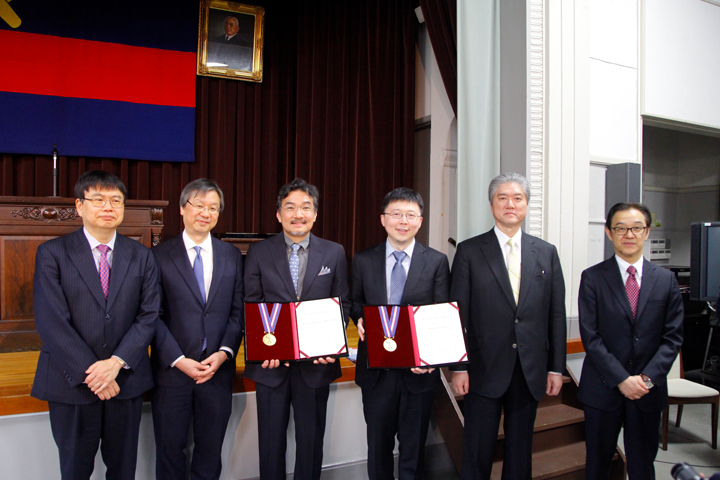 (柳沢教授(中央左)の右隣は同時受賞した米マサチューセッツ工科大学のフェン・ジャン教授)