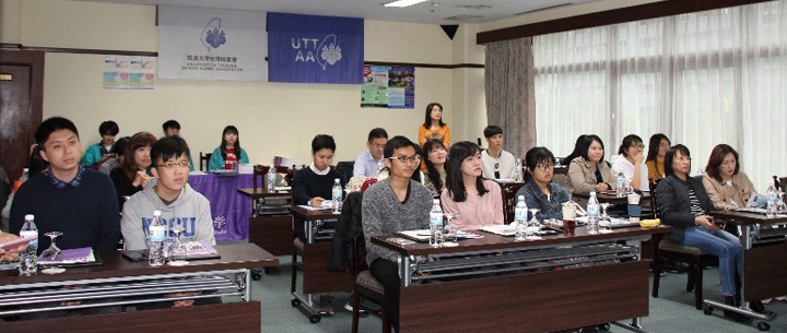 総会に先立ち、筑波大学台湾オフィス(オフィス所長:大庭良介准教授)主催による筑波大学入学・留学説明会が催され、台湾オフィス現地スタッフの林佳瑶さんによる本学の説明に留学を希望する多数の学生たちがメモをとる姿が見られました。
