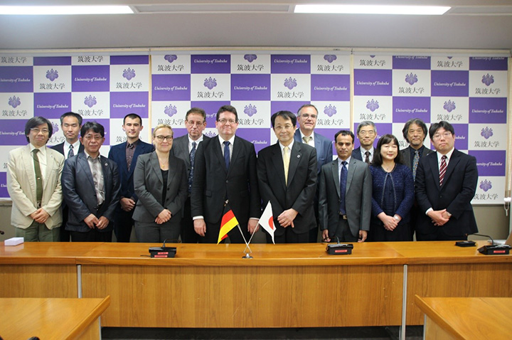 ハレ大学と本学は2007年に部局間協定を締結後、2012年に全学交流協定を締結しており、これまで市民社会組織に関する人文社会系との共同研究や数理物質系・上殿明良教授(ボンオフィス所長)との共同研究をはじめとする学術交流とともに、学生交流も活発に行われています。 昨年9月のティーテェ学長就任以降、ハレ大学は日本の大学との更なる交流の活発化を目指しており、今回は改めて本学の教育・研究分野を紹介することで既に交流が行なわれている分野以外での連携の可能性も提示することとなりました。 今回の訪問を通して,両大学間交流の更なる深化・拡大が期待されます。