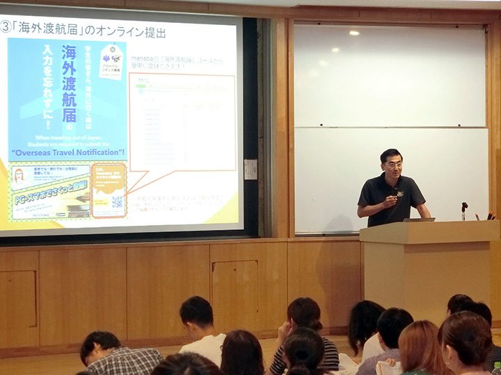 続いて,グローバル・コモンズ機構国際交流支援部門長の野村名可男准教授から,「海外渡航にむけた準備とその心得 -学生の皆さんが海外渡航する際の7つのチェック事項-」について,渡航前の学内手続き等を含めて説明しました。