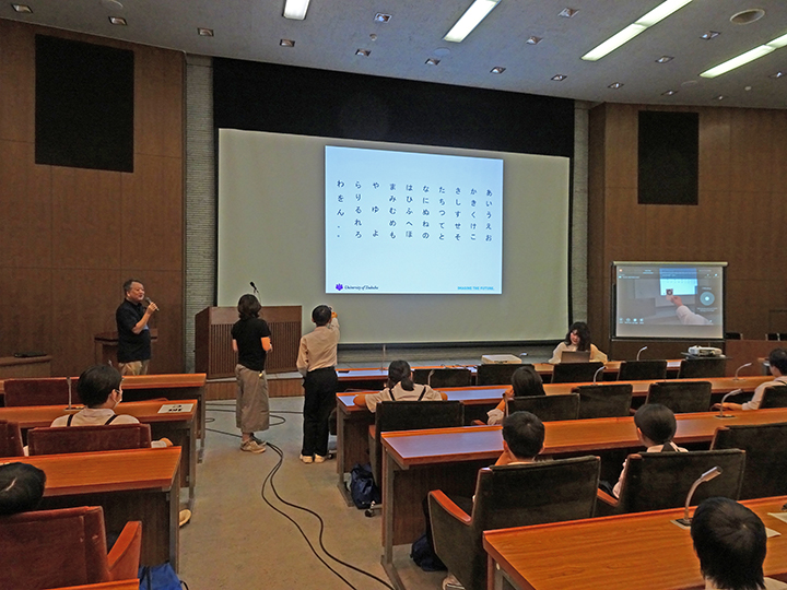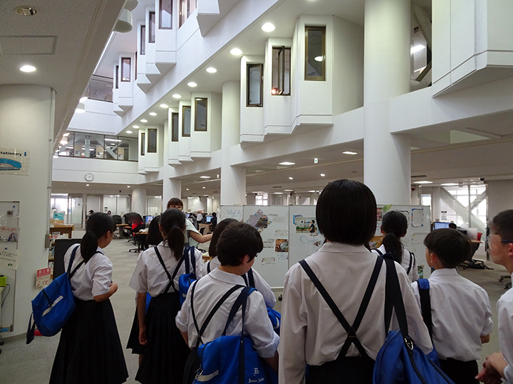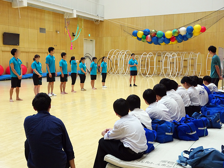 当日は、大学の概要説明の後、それぞれグループに分かれ、学生引率のもと、「特別授業(心理学を使った「見やすいデザイン」「使いやすいデザイン」について)」、「体育(ラート)」、「附属図書館見学」、「哲学カフェ」、「大学ギャラリー見学」、「留学生との交流」をそれぞれ体験しました。