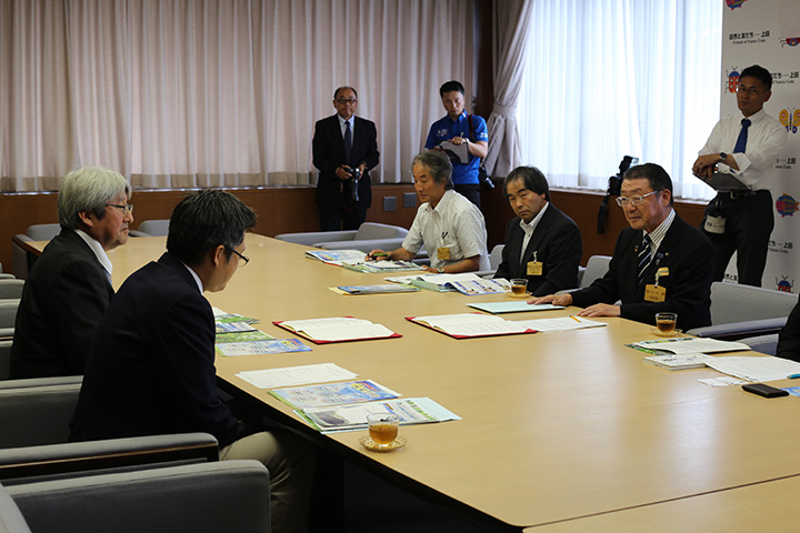 (懇談、左から、石田氏、出川氏、桜井浩真田産業観光課長、竜野秀一生涯学習文化財課長、土屋氏)