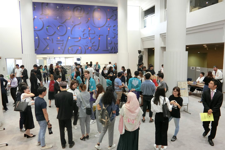 入学式を終えたばかりの新入生や秋学期入学の交換留学生等約170名が訪れ、大盛況となった会場では、各団体の代表者がそれぞれの活動について説明し、参加した新入留学生たちは、熱心に耳を傾けていました。