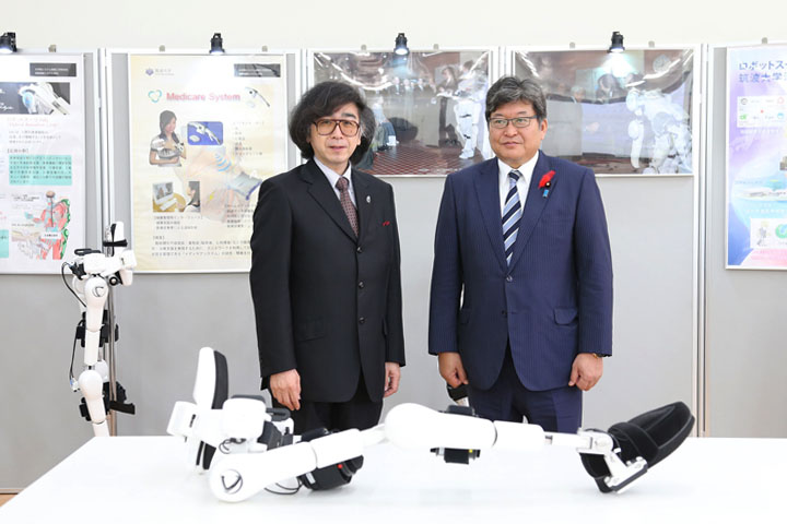 最初の視察先であるサイバニクス研究センターにおいては、山海嘉之研究統括(システム情報系教授)から、HAL医療用を代表とするサイバニックシステムを活用した最新の研究・社会実装事例を紹介しました。同センターには、国光あやの衆議院議員も同行されました。