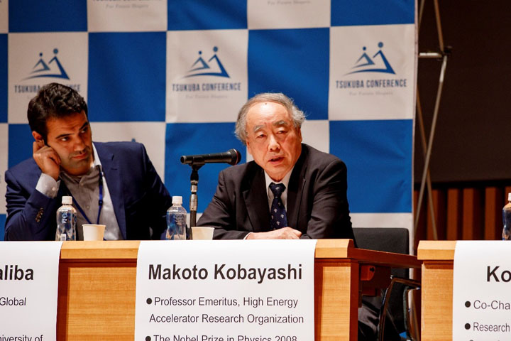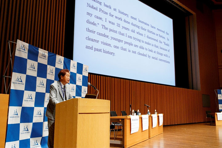 10月3日午前に「ノーベル賞受賞者を囲むスペシャルプレナリー」セッションが開催されました。本学関係者として本学元学長で茨城県科学技術振興財団理事長の江崎玲於奈氏(1973年ノーベル物理学賞)、および本学経営協議会委員で高エネルギー加速器研究機構特別栄誉教授の小林誠氏(2008年ノーベル物理学賞)が登壇し、他のノーベル賞受賞者および国内外の若手研究者等と「若手が研究者として成功するために何が必要か」についてディスカッションを行いました。メインセッション