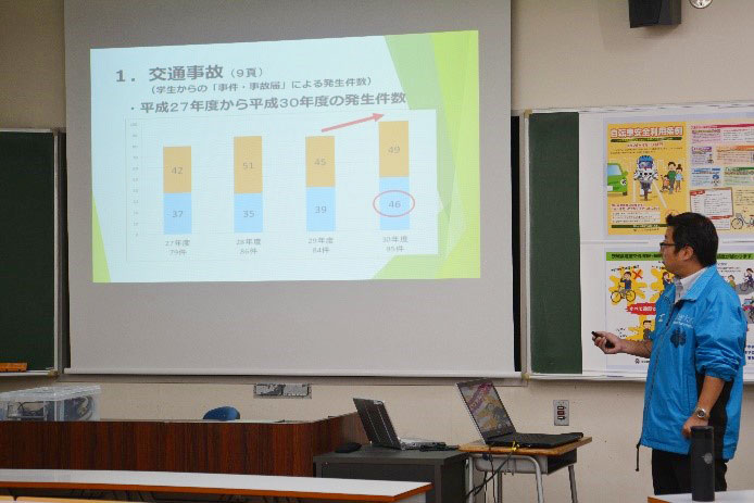 「講話Ⅰ」として、学生部学生生活課 菊地係長から、筑波大学における交通事故の現状について、平成26年度から平成30年度までの交通事故件数、大学構内及び大学周辺の危険箇所等のスライドによる説明とともに、事故防止に向けて注意を促しました。