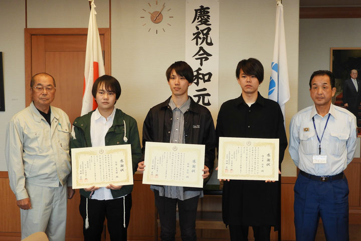 (写真:左から、三次真一郎市長、阿部晃太郎さん(電子・物理工学専攻)、村田秀征さん(情報科学類)、佐々木慎矢さん(工学システム学類)、内田正行消防長)
