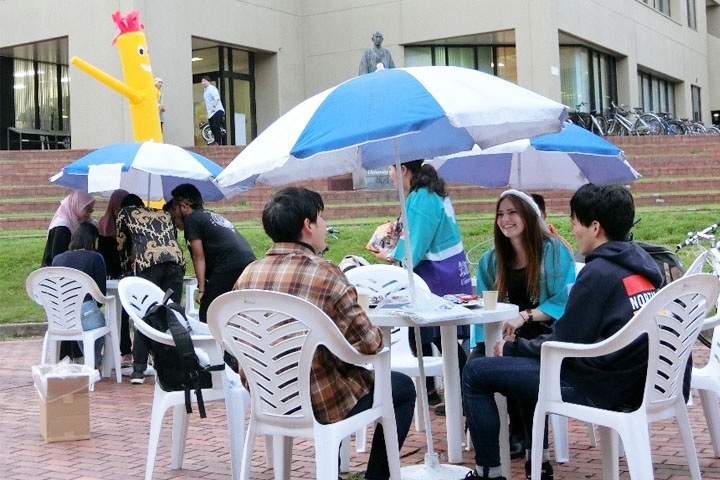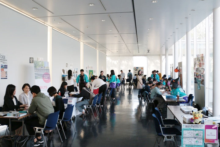 本フェアには、同日スチューデント・コモンズで開催されたドイツ留学フェアとあわせ、320名の学生の来場があり、留学に関する様々な疑問についての効率的な情報収集の機会を提供し、留学の目的に沿った情報が得られるよう21の情報ブースを設置した他、キルギス・ペテルブルグ海外研修帰国後報告会を同時開催しました。また、前回好評を得た、留学生や留学経験者とコーヒーを飲みながら交流できる「留学カフェ」は、今回も留学相談や異文化交流の場として大勢の来場者で賑わいました。