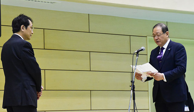 続いて、吉岡高志筑波大学校友会副会長及び塚本一也筑波みらいの会役員から、開催にあたって、同会から、寄附金目録が永田学長に手渡されました。