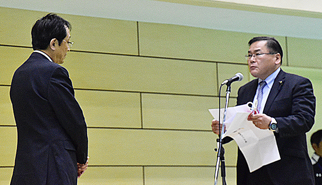 (塚本一也筑波みらいの会役員からの寄附金目録の贈呈)