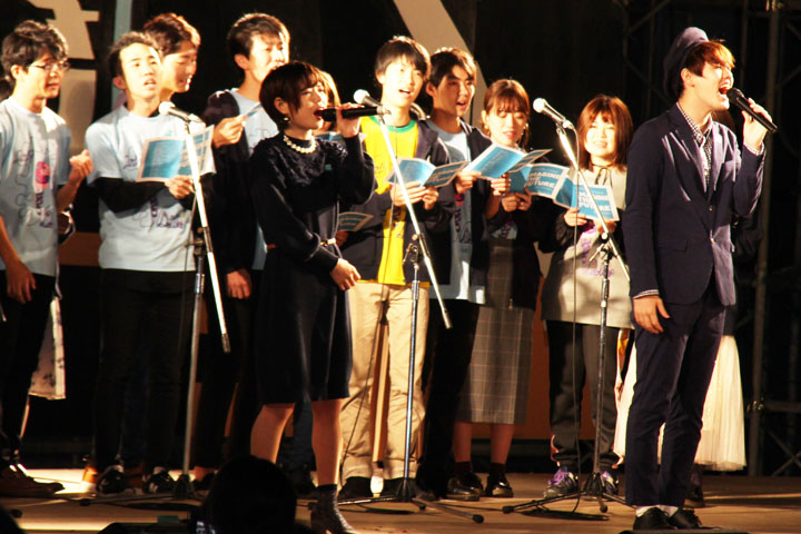 歌い手は、齊藤大智さん(生命環境学群)、Doo-Wopからは22名のメンバーが参加し、学生総勢23名が会場を巻き込んで後夜祭を盛り上げました。