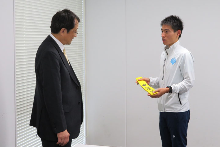 (永田学長に襷を贈る大土手嵩駅伝主将(右))