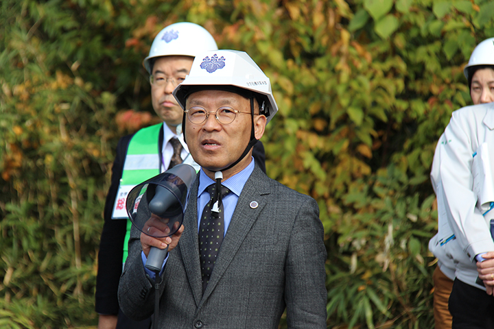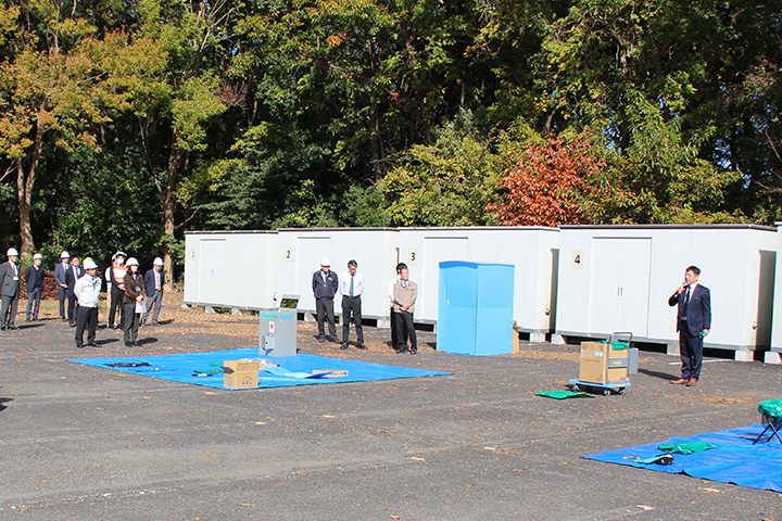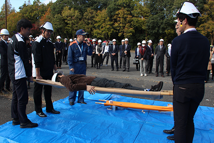本部棟で行った訓練では、つくば市消防本部桜分署等の協力による緊急時の担架搬送、組立トイレ説明会を実施しました。最後に稲垣敏之副学長(総務・人事担当)、つくば市消防本部桜分署から講評をいただきました。