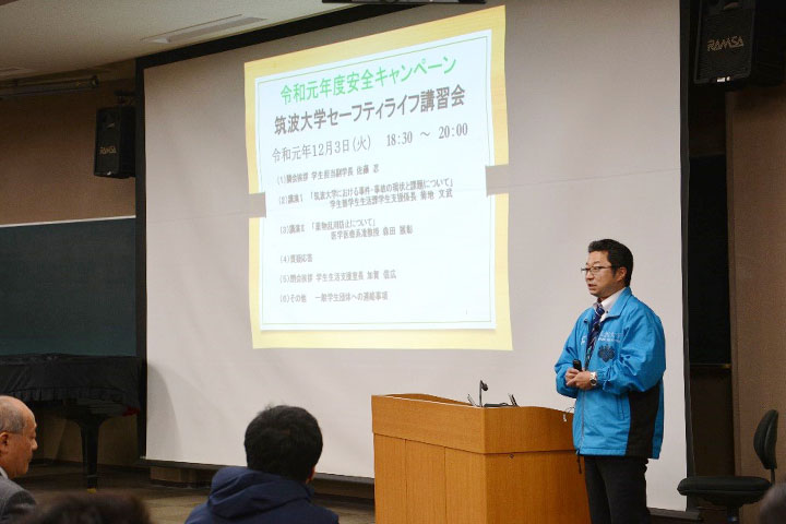 はじめに、佐藤忍副学長(学生担当)から開会の挨拶をいただき、続いて、学生生活課 菊地文武学生支援係長から、筑波大学における事件・事故の現状と課題についての講演があり、飲酒トラブルの具体例や筑波大学生の被害事件、加害事件等の説明を通して、参加学生に防犯等の意識を促しました。