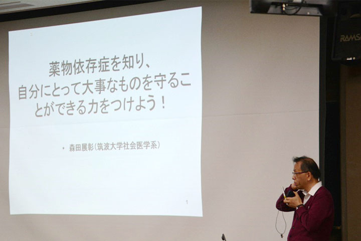 その後、講演Ⅱにおいて、医学医療系 森田展彰准教授から薬物乱用防止について講演をいただき、薬物の基礎知識、薬物使用に伴う具体的な症状、薬物使用に関する調査結果、薬物依存に至るメカニズムや薬物依存となった方からのインタビュー動画等を交え、薬物乱用の危険性について解説がありました。
