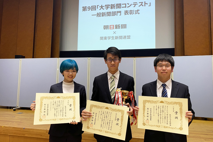 表彰式には、筑波大学新聞編集部を代表して、木村 誠・前編集長(人文・文化学群人文学類3年)、西村 大祐・編集長(人文・文化学群人文学類2年)、後藤 佳怜・副編集長(社会・国際学群社会学類2年)が参加しました。多くの専門家に丁寧に取材しており、それを分かりやすい文章と写真でまとめた点、メッセージ性があることなどが評価され「記事賞」で第1位を、オランダでの専門家や当事者、街頭でのインタビューなどの海外取材に加え、各回で日本の動きも丁寧に取り上げていた点が評価され「連載賞」でも第1位を受賞しました。「コラム賞」では、学生の身近な就職活動に関するテーマを取り上げたことが評価され、第4位となりました。