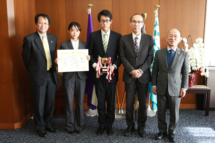 また、今回の受賞を報告するため12月23日、木村前編集長と連載賞の記事を主に担当した越智小夏記者(比較文化学類4年)、鴨志田公男・筑波大学新聞編集代表(広報室教授)が永田恭介学長、稲垣敏之副学長(総務・人事担当)を表敬訪問しました。