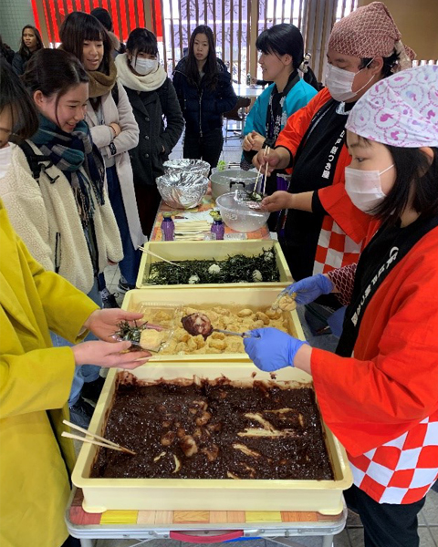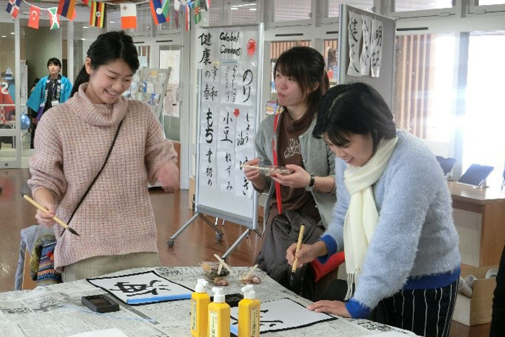 今年は、日ごろ国際交流活動を行っている学生団体や芸術専門学群で書道を専攻する学生らの協力のもと、日本のお正月の伝統行事である「餅つき」と「書初め」文化を広く紹介しました。当日は臼と杵でつきあげる昔ながらの餅つきに多くの留学生、日本人学生らがチャレンジする中、つきたてのお餅を求めて長蛇の列ができるなど、会場は熱気に包まれました。またお餅を食べ終えた参加者らは、書初めでそれぞれの思いを半紙にしたためながら交流し、笑顔で出来上がった作品を持ち帰っていました。