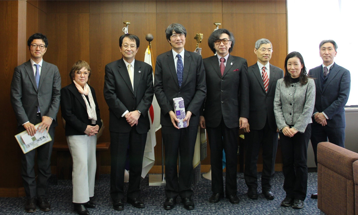 1月27日、岩間公典在デュッセルドルフ次期総領事が来訪され、永田恭介学長、ベントン・キャロライン副学長(国際担当)、大根田修大学執行役員(国際室長)、山海嘉之システム情報系教授(サイバニクス研究センター研究統括)、上殿明良数理物質系教授(ボンオフィス所長)、藤井さやかシステム情報系准教授を表敬訪問されました。