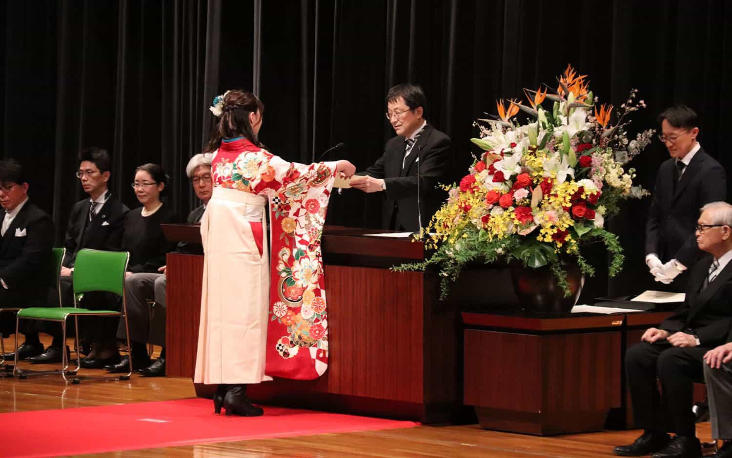 学位記授与、学長式辞、卒業生・修了生謝辞、学生表彰を行い、式典の最後には、本学混声合唱団・管弦楽団が送別の奏楽として学生歌『常陸野の』を披露し、卒業生・修了生の前途を祝しました。